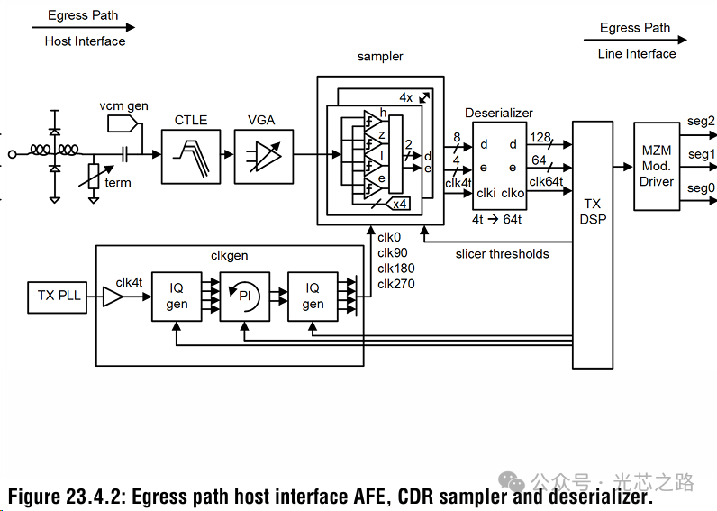 TX DSP 包含 CDR 適應功能,實現時鐘恢復環(huán)路。TX DSP 內部的分頻器級適應算法使用 16 個 9b DAC 來調整每個采樣器模塊內的 4 個閾值水平。