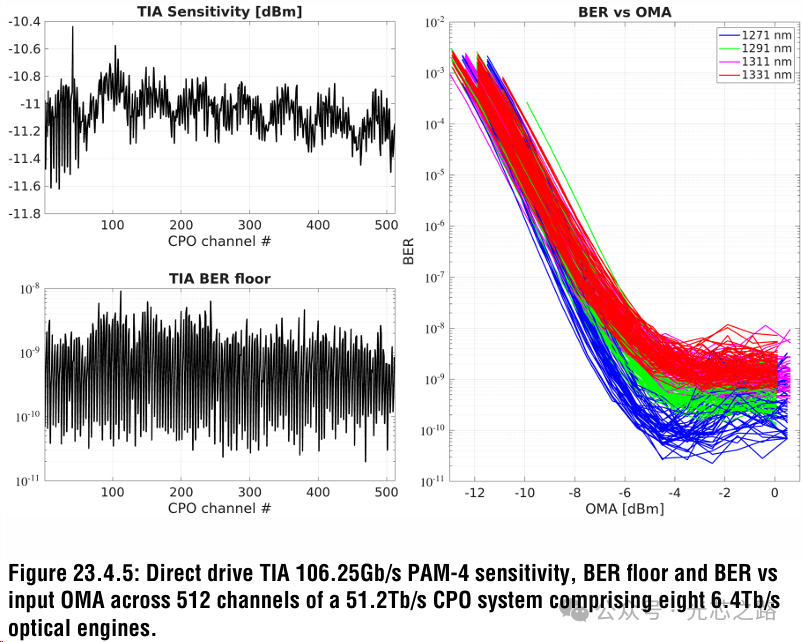 TIA性能如圖所示,已由ASIC 進行均衡處理。在51.2Tb/s CPO 系統(tǒng)(8×6.4Tb/s 光引擎,512個通道)的 所有4 個波長,BER 與輸入 OMA 曲線的對比情況如圖所示。