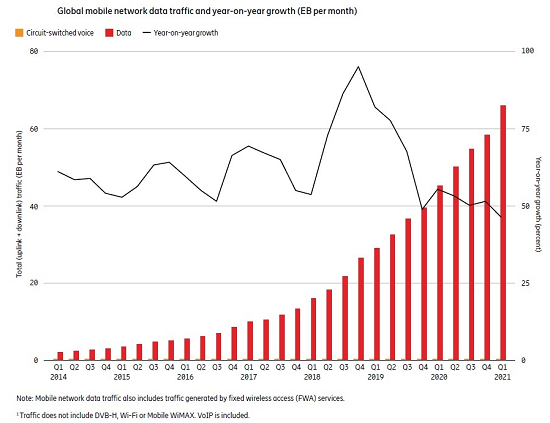 ICC訊(編譯:Nina)愛立信最新的移動報告稱,從2020年第一季度到2021年第一季度,全球移動數(shù)據(jù)流量增長了46%,相比2018年和2019年初的高達(dá)75%,這是一個更正常的水平。