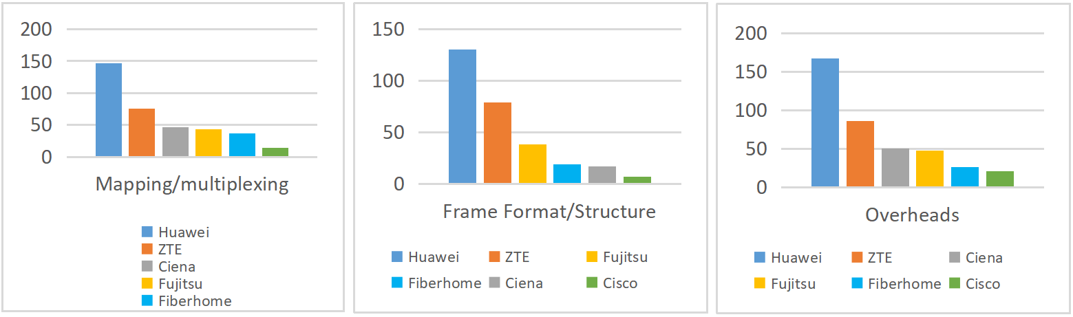 從專利申請類別來看,G.709標準系列涉及的技術(shù)主要是映射/多路復(fù)用,幀格式/結(jié)構(gòu)和開銷。不管是在哪個技術(shù)類別上,華為和中興的專利申請數(shù)量都是排名第一、第二的(見圖2)。
