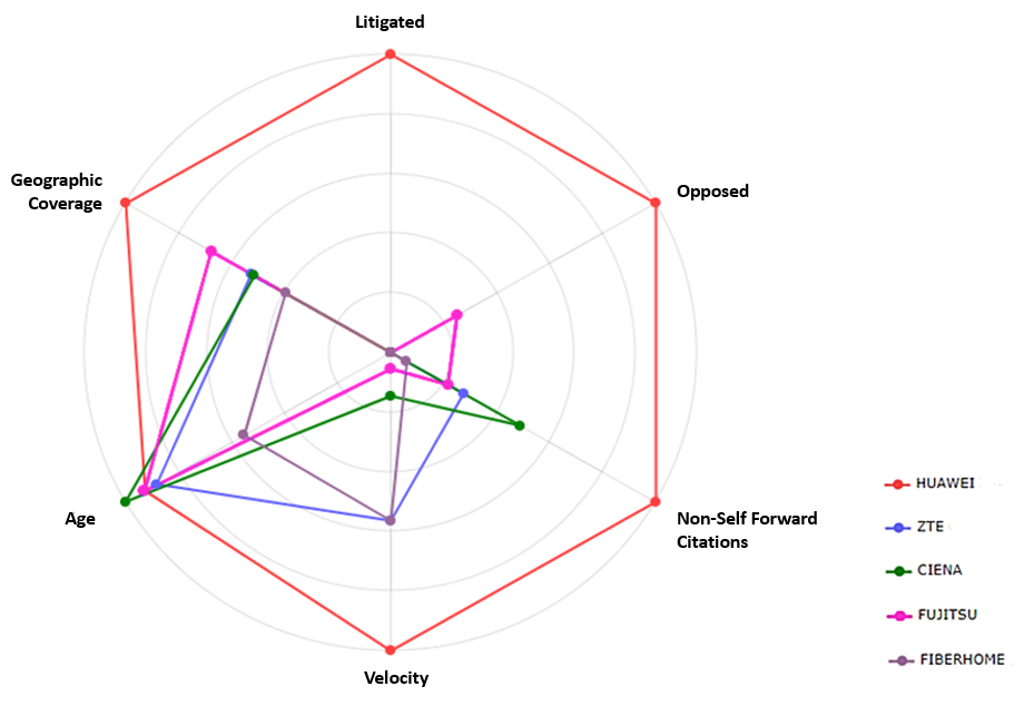 該報告還從涉訴、無效、引用次數(shù)、申請速度、專利年齡、地理覆蓋率六個維度分析了華為、中興、Ciena、Fujitsu、烽火五位專利權(quán)人的專利價值。從圖3可以看出,五位專利權(quán)人的專利平均年齡都相對較低(專利申請日后5-9年不等),這表明OTN領(lǐng)域的競爭者都在積極申請新的專利,并尋求在各自的技術(shù)領(lǐng)域保持最新的技術(shù)水平。華為的涉訴專利、被異議專利的數(shù)量最多,這表明華為的專利是被競爭者視為價值高,有威脅的專利。同時,華為、Ciena專利的被引用次數(shù)相對較高,這表明其專利在本技術(shù)領(lǐng)域的影響力大,引導(dǎo)著本領(lǐng)域技術(shù)的發(fā)展方向。