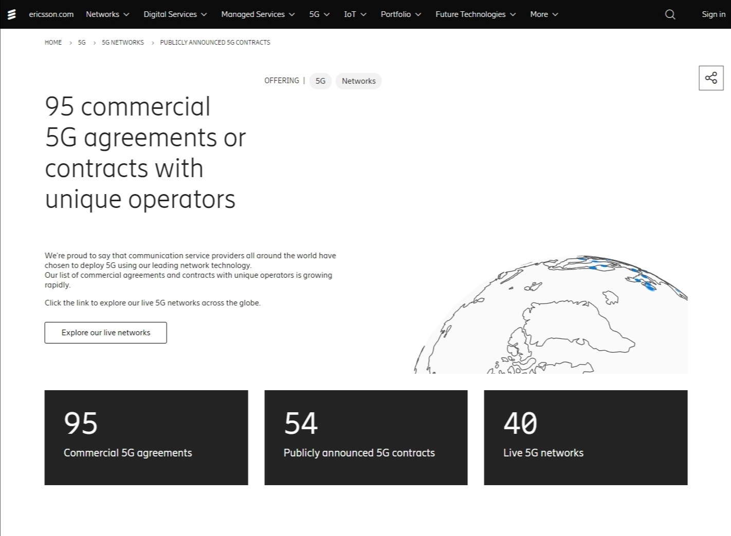 ICC訊 愛立信官網(wǎng)數(shù)據(jù)顯示,目前愛立信已經(jīng)斬獲95個5G商用合同,其中愛立信已經(jīng)與54家運營商客戶達成可公示的5G商用合同,目前在23個國家為40個已經(jīng)正式運行的5G商用網(wǎng)絡提供設備。