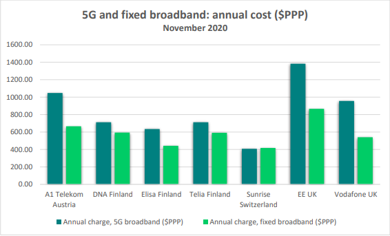 圖1 Annual cost of 5G and comparable fixed broadband services, $PPP. Source: Point Topic