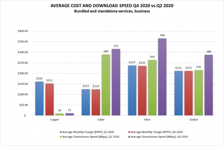總體而言,整個(gè)2020年,基于固定光纖的住宅和企業(yè)寬帶資費(fèi)的平均價(jià)格繼續(xù)下降,而平均帶寬則有所上升。