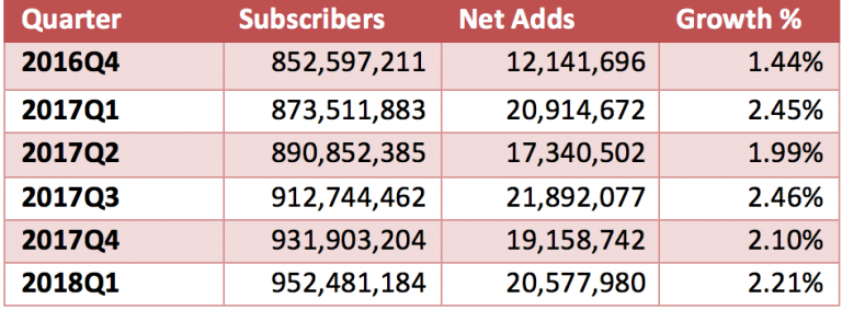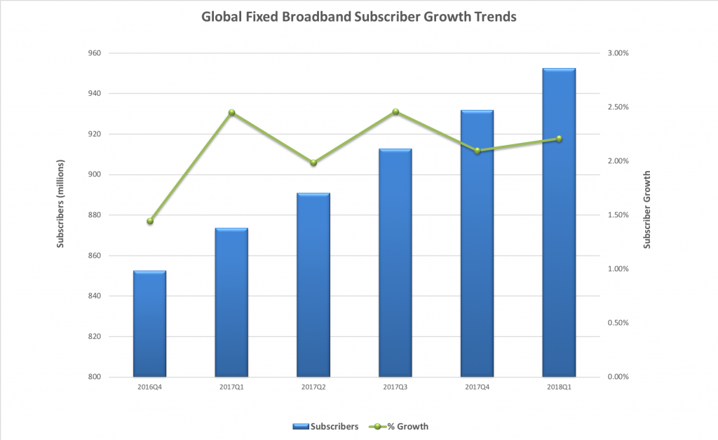 ICCSZ訊(編譯:Vicki)截止到2018年第一季度末,全球固定寬帶用戶與上一季度相比略有增長,為2.21%。全球固定寬帶連接數(shù)量達(dá)9.52億。
