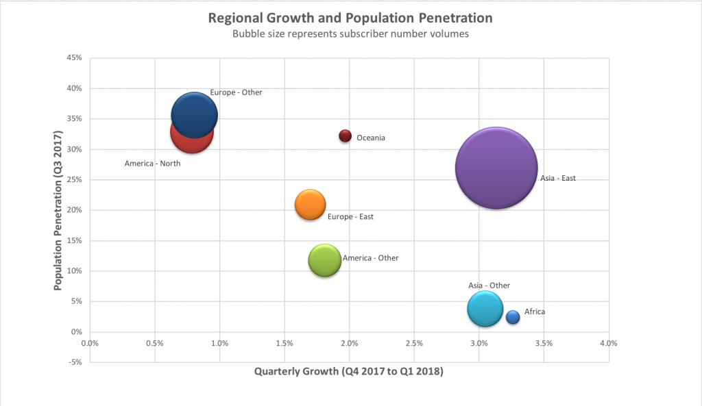 2018年第一季度,固定寬帶用戶凈增量有64%來自東亞。最大區(qū)域市場(chǎng)份額保持在47%左右??傮w而言,自2017第四季度以來,所有地區(qū)的市場(chǎng)份額基本保持不變,東亞地區(qū)的季度增長率為3.1%,上個(gè)季度為2.8%。除美洲外,其他地區(qū)的增長放緩,其中北美的季度增長率為0.24%,美國增長率為0.2%。