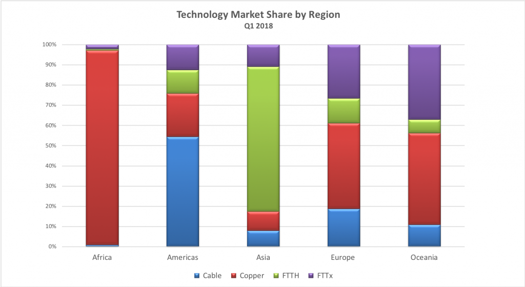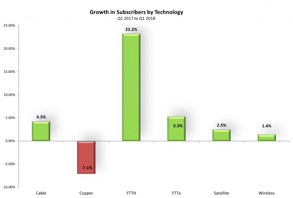 就年度變化而言,2017年第一季度至2018年第一季度全球Copper數(shù)量下降了7%,而FTTH連接數(shù)量增加了23%,F(xiàn)TTx增長了5%。光進(jìn)銅退的趨勢(shì)依然繼續(xù)。
