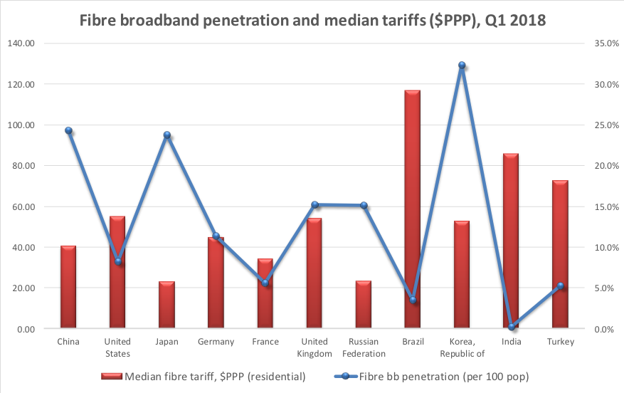 值得注意的是,高光纖寬帶普及率并不一定意味著各個(gè)市場(chǎng)的消費(fèi)者都能獲得同等競(jìng)爭(zhēng)力的定價(jià)。 例如,中國的光纖到戶寬帶資費(fèi)幾乎是日本的兩倍,兩國的光纖穿透水平和直接光纖(FTTH / B)相似。 在圖表中顯示的選定國家中,巴西,印度和土耳其似乎是潛在光纖供應(yīng)商最具吸引力的市場(chǎng),因?yàn)榈蜐B透率和高終端用戶價(jià)格意味著有利的競(jìng)爭(zhēng)環(huán)境。