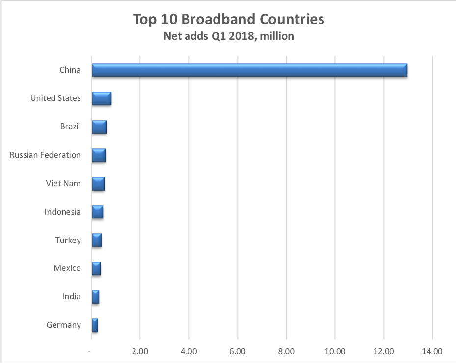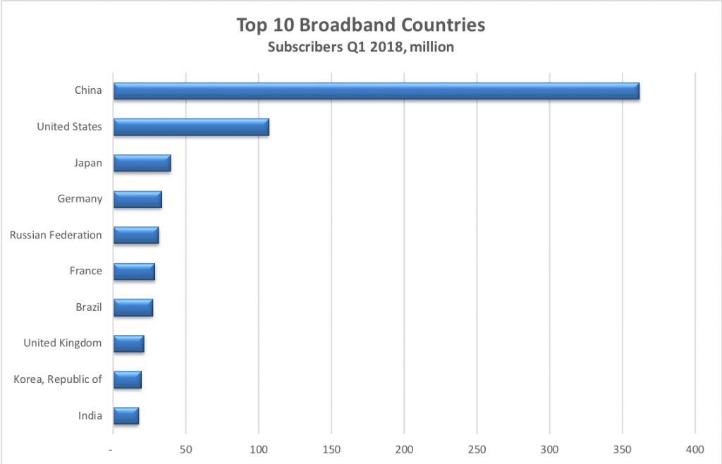 自2016年第二季度以來,固定寬帶用戶總數(shù)排名前十的國家保持不變。 中國約有3億的固定寬帶用戶,繼續(xù)創(chuàng)下全球最大的寬帶網(wǎng)絡(luò)增長。
