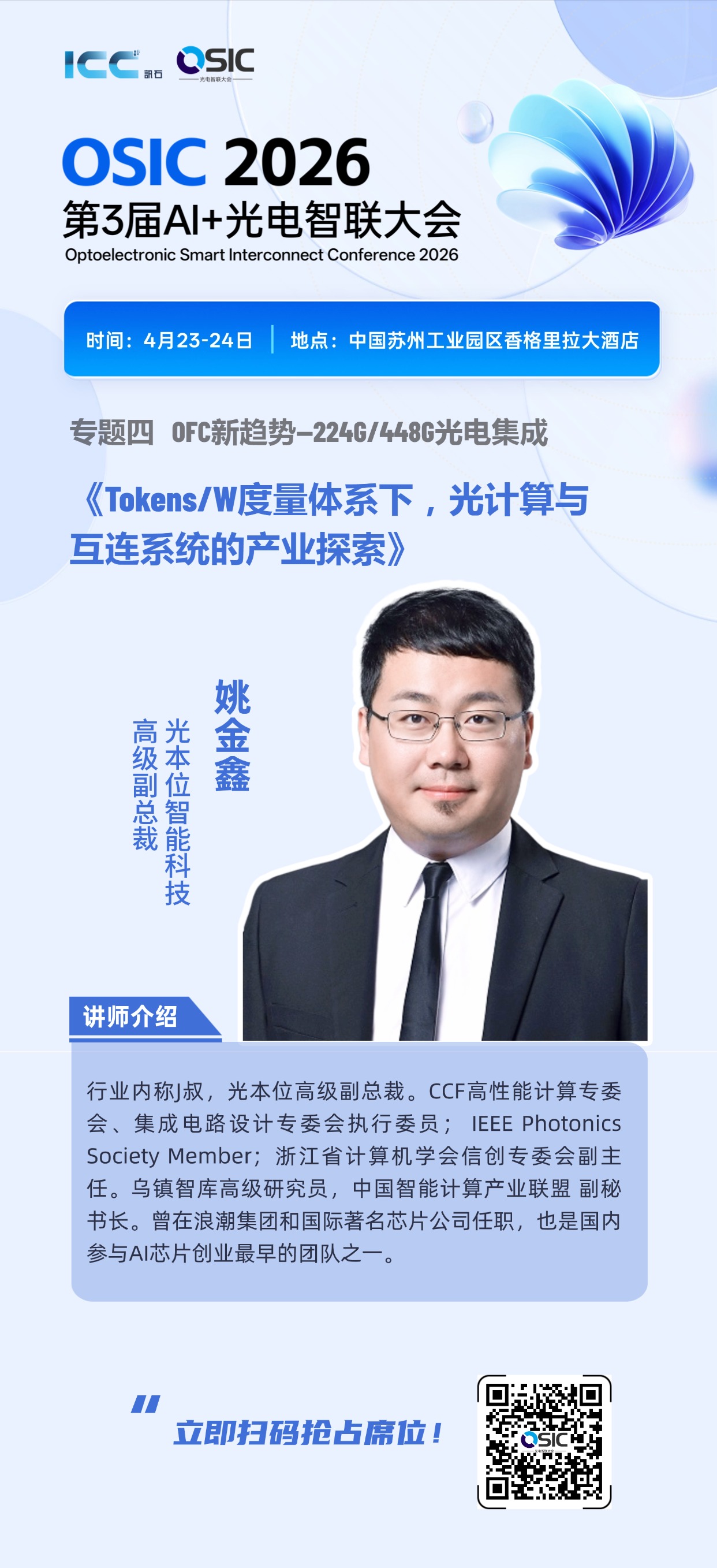 演講時(shí)間、專題:2026年4月24日, 下午13:55-14:20, 專題四《OFC新趨勢(shì)—224G/448G光電集成》