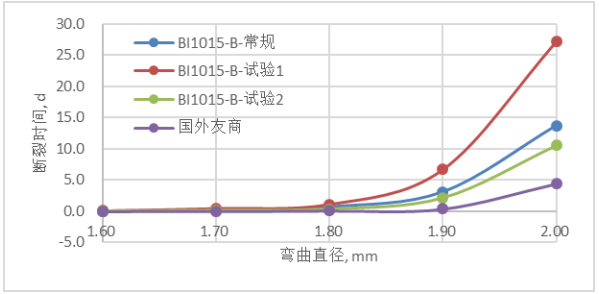 圖5 極小彎曲半徑下,國內外彎曲不敏感光纖斷裂時間對比