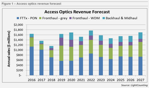 到2027年,全球接入光學(xué)器件的年收入預(yù)計將達14-16億美元。在預(yù)測期間,該市場將經(jīng)歷幾年的下滑,然后在2025-2027年重返增長。受連續(xù)幾代技術(shù)部署浪潮的驅(qū)動,無線和FTTx市場發(fā)展呈現(xiàn)周期性,而LC預(yù)計6G無線和25G/50G PON將在預(yù)測期內(nèi)的最后幾年開始部署。