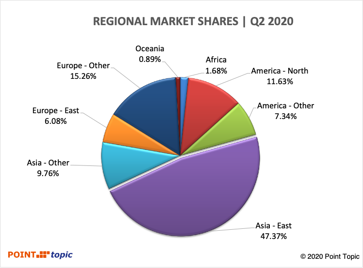 固定寬帶用戶凈增數(shù)中,僅有略超過53%來自東亞(圖3),該地區(qū)在所有用戶中也占據(jù)了最大的區(qū)域市場份額,為47%(圖4)。 與2020年第一季度相比,東亞的市場份額增加了0.4%,而其他所有地區(qū)(非洲除外)的市場份額都下降了。