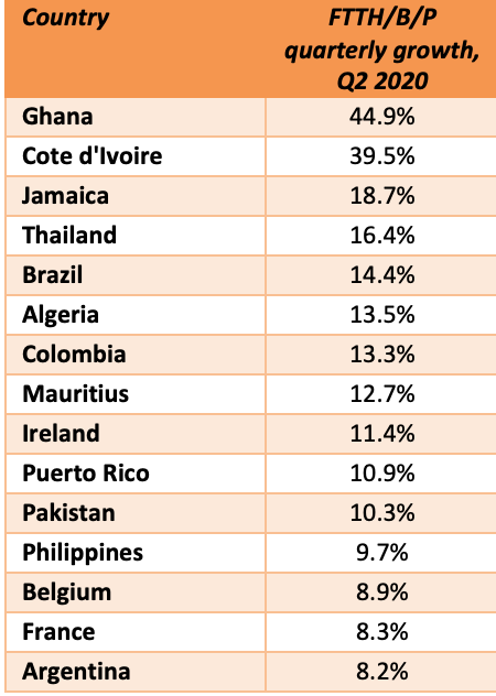 2020年第二季度,F(xiàn)TTH / B / P增長率最高的是發(fā)展中市場,在某些基數(shù)較低的市場中,愛爾蘭,比利時和法國的增長率也很高。