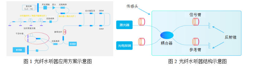 光纖水聽器是水聲探測(cè)系統(tǒng)中的重要部件(見圖1),它是先進(jìn)光纖光電子技術(shù)與水聲工程技術(shù)結(jié)合的新產(chǎn)物,在海洋環(huán)境監(jiān)測(cè)、先進(jìn)水聲裝備等方向具有廣闊的應(yīng)用前景。按照原理分類,光纖水聽器有強(qiáng)度型、偏振型、相位干涉型等。其中,相位干涉型光纖水聽器因其精度高、穩(wěn)定性好、體積小以及易于大規(guī)模組成陣列等優(yōu)勢(shì),已成為目前研究和開發(fā)使用的主要對(duì)象。相位干涉型光纖水聽器基于Michelson和Mach-Zehnder干涉原理制成,其干涉結(jié)構(gòu)已進(jìn)入成熟的產(chǎn)品化階段。兩者基本原理相同(如圖2所示),由激光器發(fā)出的激光經(jīng)過光纖耦合器分為兩路:一路構(gòu)成光纖干涉儀的傳感臂,接受聲波的調(diào)制,另一路則構(gòu)成參考臂,提供參考相位。兩束波經(jīng)后端反射膜反射后返回光纖耦合器,發(fā)生干涉,干涉的光信號(hào)經(jīng)光電探測(cè)器轉(zhuǎn)換為電信號(hào),經(jīng)過信號(hào)處理就可以拾取聲波的信息。