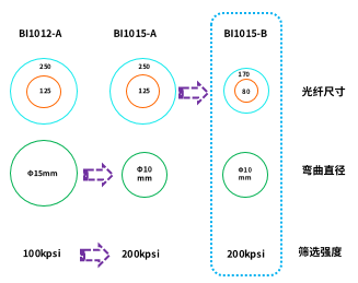 水聽器用彎曲不敏感光纖目前普遍朝著細(xì)徑化和高強(qiáng)度的方向發(fā)展,如何在減小光纖直徑的同時(shí)保障光纖的高強(qiáng)度是一大難點(diǎn)。如圖4,長(zhǎng)飛第二代彎曲不敏感光纖的最小抗彎直徑目前設(shè)計(jì)為10mm,其光纖尺寸從125/250μm減小到80/165μm,于此同時(shí)光纖的篩選強(qiáng)度仍可以繼續(xù)保持200kpsi。另外第三代產(chǎn)品BI1015-F和BI1015-P保持了光纖的細(xì)徑、高篩選張力外,著重于涂層的改進(jìn)與優(yōu)化,采用耐水煮材料大大提高了光纖的機(jī)械穩(wěn)定性。