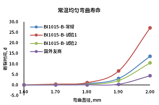 在強(qiáng)度上,除了滿足200kpsi篩選,在抗拉和抗老化方面也表現(xiàn)良好(如圖7所示)。對(duì)客戶所關(guān)心的彎曲半徑下的使用壽命,我們也進(jìn)行了比較驗(yàn)證(如圖8所示),所得驗(yàn)證數(shù)據(jù)根據(jù)行業(yè)內(nèi)默認(rèn)公式推導(dǎo)得出的使用壽命結(jié)果遠(yuǎn)超過了客戶要求。