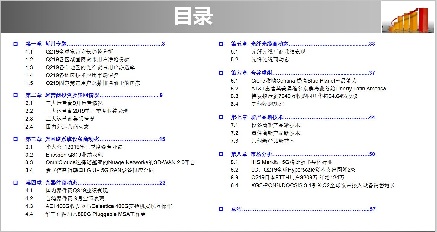 市場(chǎng)分析部分:IHS Markit的最新數(shù)據(jù)顯示,全球半導(dǎo)體行業(yè)正處于巨大衰退之中??萍夹袠I(yè)今年的收入將比去年下降近13%。但是,該公司的分析師表示-5G將挽救半導(dǎo)體行業(yè)。Lightcounting表示2019年以太網(wǎng)光收發(fā)器市場(chǎng)將下降18%,創(chuàng)下該市場(chǎng)歷史記錄的最大降幅。來(lái)自GSA(全球移動(dòng)供應(yīng)商協(xié)會(huì))十月份發(fā)布的數(shù)據(jù)顯示,全球103個(gè)國(guó)家/地區(qū)的321家運(yùn)營(yíng)商正在進(jìn)行5G投資,其投資的形式包括測(cè)試/試用、獲得牌照、部署網(wǎng)絡(luò)和啟動(dòng)服務(wù)。62家運(yùn)營(yíng)商在其網(wǎng)絡(luò)中部署了符合3GPP要求的5G技術(shù)。Dell'Oro在其“Broadband Access 2Q 2019季度報(bào)告”中指出,2019年第二季度全球?qū)拵Ы尤朐O(shè)備的銷售額同比增長(zhǎng)3%。據(jù)市場(chǎng)調(diào)查顯示,XGS-PON光線路終端(OLT)的采購(gòu)量年增長(zhǎng)達(dá)874%,同時(shí)DOCSIS 3.1 CPE的需求強(qiáng)勁,彌補(bǔ)了電纜MSO之間CCAP支出的下降,推動(dòng)季度總收入達(dá)到32億美元。