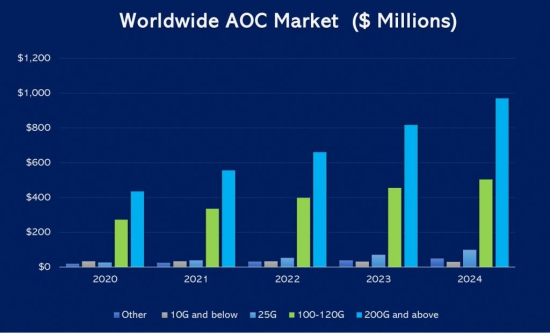 ICC訊(編譯:Nina)上月中,通信行業(yè)研究公司CIR發(fā)布了一份關(guān)于有源光纜(AOC)市場的新報告(Active Optical Cables: Market Forecasts: 2020 To 2024),稱有源光纜市場將從2020年的9.54億美元增長至2024年的19億美元。數(shù)據(jù)中心急于部署100G連接,以及從2020年開始數(shù)據(jù)中心的新交換機將開始配置400G端口,是驅(qū)動該市場收入規(guī)模翻倍的原因。