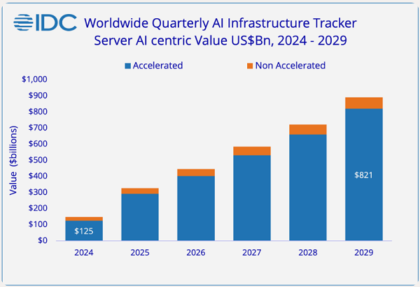 2025年第三季度的創(chuàng)紀錄表現,意味著市場正從最初的試點階段轉向多年的擴張期。預計2025年全年支出將達到3340億美元,到2029年將超過9020億美元。預計到2027年,年增長率將保持在30%以上,隨后在預測期的后幾年放緩至25%左右的中段區(qū)間。這一結果突顯了加速計算(Accelerated compute)的核心作用,因為企業(yè)和云提供商正轉向支持日益復雜的人工智能工作負載。