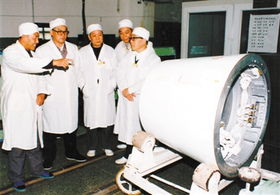 陳定昌(右一)任原航空航天工業(yè)部第二研究院院長期間深入車間