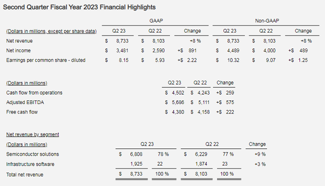 ICC訊(編譯:Nina)美國加州圣何塞,2023年6月1日--博通公司(Broadcom Inc.)(納斯達(dá)克:AVGO),一家設(shè)計(jì)、開發(fā)和提供半導(dǎo)體和基礎(chǔ)設(shè)施軟件解決方案的全球技術(shù)領(lǐng)導(dǎo)者,今天公布了其截至2023年4月30日的2023財(cái)年第二季度(第二財(cái)季)財(cái)務(wù)業(yè)績。