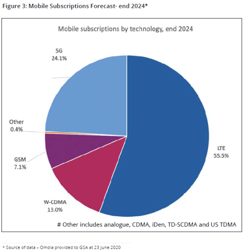 從2020年底到2024年底,GSM份額將從15.4%下降到7.1%,W-CDMA份額將從20.0%下降到13.0%。