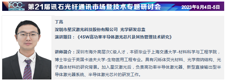 屆時,深圳市星漢激光科技股份有限公司 光學研發(fā)總監(jiān) 丁亮將在本屆訊石研討會9月4日的專題五《激光雷達對話光通信 2.0》發(fā)表主題為《45W高功率半導體激光芯片及其熱管理技術研究》的演講,激光器廣泛應用于工業(yè)加工、光通訊、生物醫(yī)療、科研、軍工等各個領域。半導體激光芯片是激光器的核心元件,是整個激光產(chǎn)業(yè)鏈的基石。針對高亮度、高功率的光纖耦合半導體激光器及直接輸出半導體激光器需求,星漢激光開展了976nm高功率半導體激光芯片單管的研發(fā)工作,單芯片輸出功率達45W@45A,PCE>50%。在此芯片平臺上,開發(fā)了高功率波長合束的半導體激光器泵浦及DDL整機開發(fā),實現(xiàn)了220μm光纖芯徑耦合輸出1800W高亮度激光。單管輸出功率的提升,也對激光器的熱管理技術帶來了挑戰(zhàn)。星漢激光進行了高導熱金屬化AlN陶瓷熱沉研發(fā)及泵浦封裝散熱優(yōu)化設計,保證了高功率激光單管耦合的熱穩(wěn)定性和可靠性。