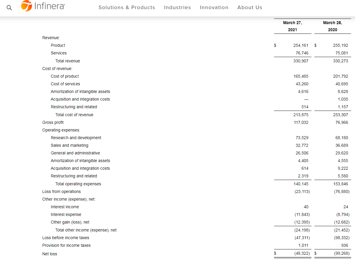 ICC訊(編譯:Vicki)智能傳輸網(wǎng)絡(luò)提供商Infinera公司公布了其截至2021年3月27日的第一季度財(cái)務(wù)業(yè)績(jī)。
