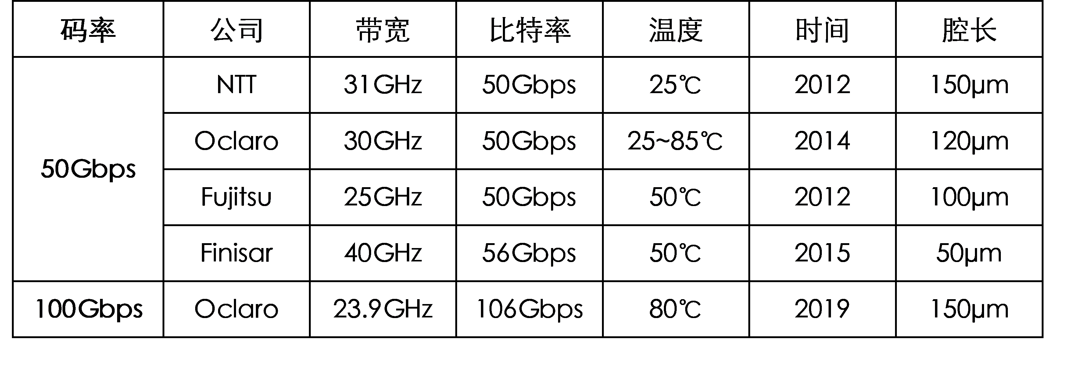 潘彥廷博士表示,直調(diào)激光器的設(shè)計(jì)瓶頸在于載子密度不均進(jìn)而引發(fā)光電信號高速調(diào)制上的問題,因此在信號傳輸過程中會出現(xiàn)過沖、抖動、延遲、啁啾等等的情況。在國際研討會論文的高速光芯片發(fā)表歷程,2012年NTT首次提出了50Gbit/s直調(diào)激光器,在25℃帶寬達(dá)到31GHz,利用降低寄生電容的BCB的設(shè)計(jì)。同年Fujitsu也發(fā)表25GHz帶寬,50Gbit/s直調(diào)激光器在50℃下操作,接著2014年Oclaro發(fā)表了50Gbs 直調(diào)激光器賦予其在25~85℃更寬溫條件下使用。2015年Finisar發(fā)表高帶寬40GHz激光器,操作在50℃下可達(dá)50Gbit/s。 2019年Oclaro更推出的106Gbps激光器,溫度可操作在80℃,以上的高速產(chǎn)品基本特性表現(xiàn)已經(jīng)非常優(yōu)異,下一步需要考量的是商用化后的可靠性議題。