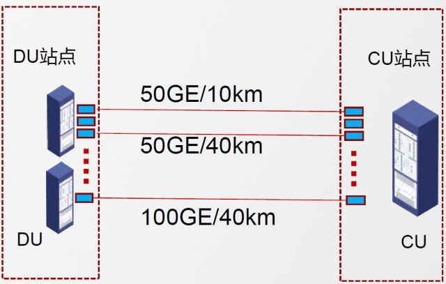 圖 | 基于如下假設(shè):前傳接口:eCPRI, 100MHz, 256QAM調(diào)制, 1個DU支持10個基站, 1個CU支持8個DU