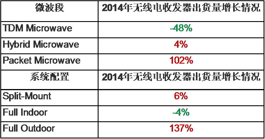 2014年微波回程設(shè)備需求強(qiáng)勁反彈。經(jīng)過幾年的發(fā)展,微波射頻收發(fā)器在2014年取得了巨大的成就,出貨量增長高達(dá)兩位數(shù)。