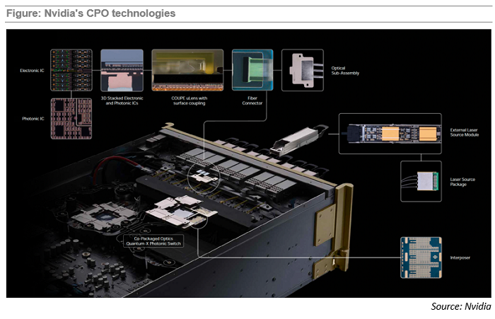 該技術(shù)的核心組件包括由臺積電(TSMC)制造的電子和光子集成電路,并以3D堆疊方式組裝。臺積電的緊湊型通用光子引擎(COUPE)技術(shù)包含用于表面耦合光纖陣列的微透鏡。在Quantum-X光子平臺中,光學(xué)引擎通過中介層與交換機(jī)ASIC連接。英偉達(dá)未透露各組件的具體作用,但其CPO合作伙伴包括波若威、Coherent、Corning、Fabrinet、富士康、Lumentum、扇港、SPIL、住友、天孚和臺積電。