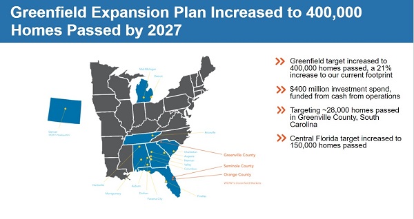 WOW還宣布,它現(xiàn)在的目標(biāo)是到2027年為40萬(wàn)戶(hù)家庭提供FTTP網(wǎng)絡(luò)建設(shè),這實(shí)際上是最初承諾的兩倍。該公司表示,這些擴(kuò)建將使WOW的足跡增加21%。這項(xiàng)新的計(jì)劃需要WOW投資4億美元進(jìn)行擴(kuò)張。擴(kuò)張將影響該公司資本支出。WOW表示,未來(lái)三年的平均支出為每年 2.25億美元,其中1.04-1.05億美元用于增長(zhǎng)項(xiàng)目。