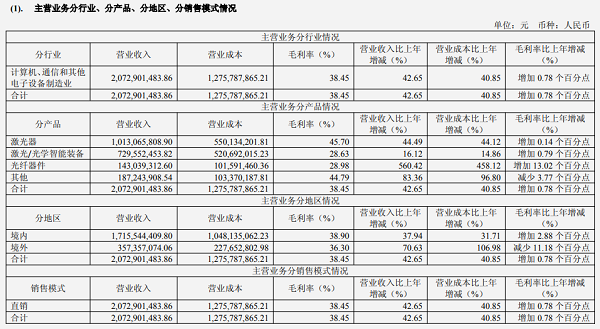 從業(yè)務(wù)結(jié)構(gòu)來看,公司主要分為激光器、激光/光學(xué)智能裝備和光纖器件三大板塊,各板塊均實(shí)現(xiàn)不同程度增長。