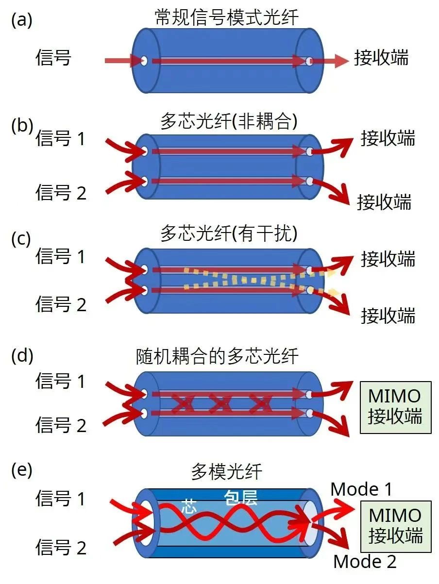 當(dāng)一個(gè)光信號在光纖的芯部傳播時(shí),它以各種振動狀態(tài)傳播,同時(shí)在芯部和包層的邊界處重復(fù)全反射(圖1e)。這些不同的振動狀態(tài)就是傳播模式。多模光纖有一個(gè)大的纖芯直徑,在一個(gè)纖芯內(nèi)存在多種模式。在多模光纖的傳播、輸入/輸出和接續(xù)過程中會出現(xiàn)不同模式之間的信號干擾,這就需要使用MIMO數(shù)字信號處理*?來消除干擾。由于到達(dá)接收器之前的時(shí)間差,不同模式的信號需要優(yōu)化光纖和重載的數(shù)字信號處理。到目前為止,多模光纖傳輸最多可使用55種模式。