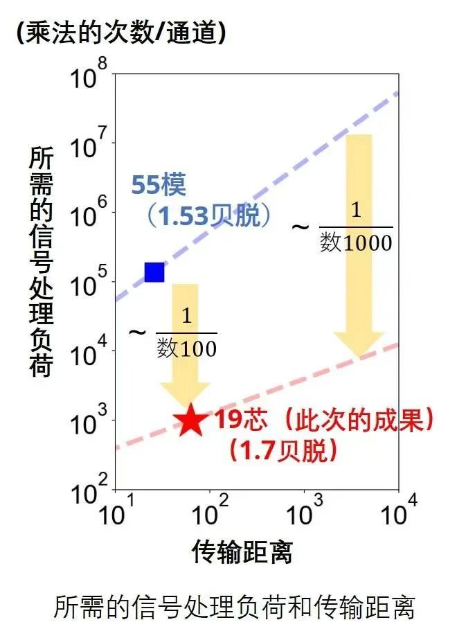 使用多模和耦合型多芯光纖進(jìn)行傳輸,在進(jìn)行模式分離時(shí)幾乎總是需要多輸入多輸出(MIMO)處理(為每個(gè)模式/芯分離成獨(dú)立的信號通道) MIMO 是一種信號處理技術(shù),在無線通信中用于消除多徑干擾。在光通信中,它被用來消除在同一光纖中傳播的不同光信號之間的干擾。MIMO處理的負(fù)荷(功耗)主要由乘法的次數(shù)決定,并與模式數(shù)的平方和濾波器函數(shù)的長度成正比,用于反向再生信號在光纖中傳播的影響。在多模光纖傳輸中,濾波函數(shù)的長度取決于每個(gè)模式的傳播速度差,而傳播速度差通常與光纖長度成比例累積,導(dǎo)致長距離傳輸?shù)男盘柼幚碡?fù)荷很大。在耦合的多芯光纖傳輸中,每個(gè)空間通道(芯)的傳播特性都是均勻的,濾波函數(shù)的長度與傳輸距離的二分之一功率成正比。當(dāng)在10,000公里的傳輸距離上進(jìn)行比較時(shí),這是一個(gè)跨洋級的傳輸距離,與55模式傳輸相比,耦合的19芯系統(tǒng)可以將每個(gè)信道的MIMO處理負(fù)荷減少多達(dá)幾千倍。(圖2)