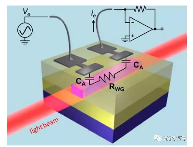 該方案在待測波導附近制作兩個金屬電極。將硅波導看成一根導線,由于Si-SiO2界面處存在表面態(tài)吸收(surface state absorption),導致波導內(nèi)的載流子濃度會隨著波導內(nèi)的光強變化而變化。而載流子濃度會影響電導率,利用這兩個金屬電極測出電導率的變化,進而知曉硅波導內(nèi)光強的變化。實驗時,一個電極與交變電壓源相連,另一電極與跨阻放大器相連,用于接收信號。
