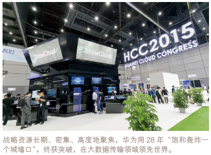 從創(chuàng)立至今,華為只在攻擊大數(shù)據(jù)傳送管道這個(gè)城墻口投入全部戰(zhàn)略資源。華為每年用500億元左右的研發(fā)投入,500億至600億元的市場和服務(wù)的投入,聚焦于管道,飽和攻擊,終于炸開了這個(gè)城墻,在大數(shù)據(jù)傳送技術(shù)上達(dá)到世界領(lǐng)先。在華為的戰(zhàn)略家眼中,隨著大數(shù)據(jù)越來越擴(kuò)張,管道會(huì)像太平洋一樣粗。華為今天真正進(jìn)入到了藍(lán)海市場,在管道領(lǐng)域已經(jīng)全面領(lǐng)先,但華為還要持續(xù)密集地在管道戰(zhàn)略上加大投入。