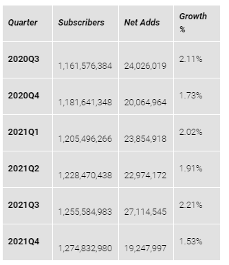 2021年第四季度,固定寬帶用戶季度增長率為1.5%,連接數(shù)達(dá)到 12.7 億。 增長率略低于 2020年相應(yīng)季度。