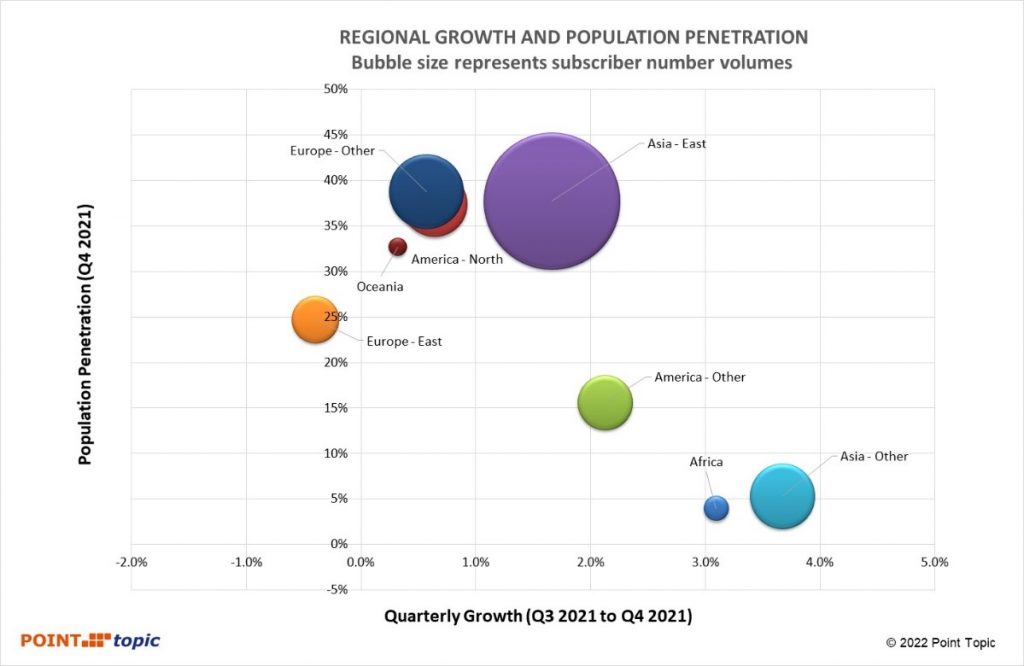 Figure 7. Penetration and quarterly growth by region (size of bubble represents subscriber volume in Q4 2021). Source – Point Topic.