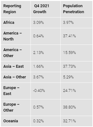 與上一季度相比,2021年第四季度,美洲、東亞和整個(gè)歐洲的固定寬帶用戶增長放緩。 非洲、亞洲和其他地區(qū)增長加快,而大洋洲幾乎沒有變化。