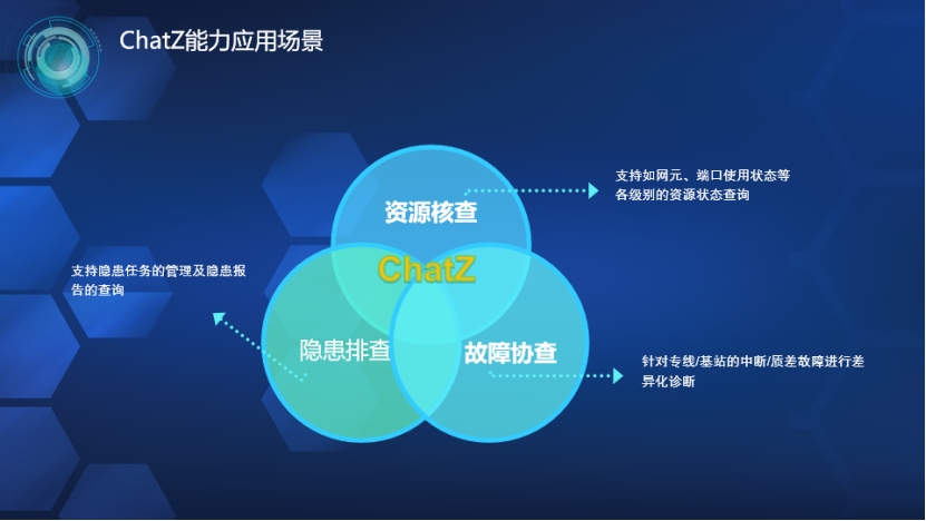 在傳統(tǒng)運(yùn)維環(huán)境下,運(yùn)維人員受限于繁瑣的菜單切換和低效的查詢定位,在應(yīng)對(duì)規(guī)模大、復(fù)雜度高的網(wǎng)絡(luò)維護(hù)任務(wù)時(shí),常常遇到故障定位難,問題解決速度慢等挑戰(zhàn)。為解決上述問題,中興通訊開發(fā)了能夠理解用戶運(yùn)維意圖并具備資源核查、報(bào)障協(xié)查和隱患排查三大功能的交互對(duì)話式AI運(yùn)維機(jī)器人ChatZ。