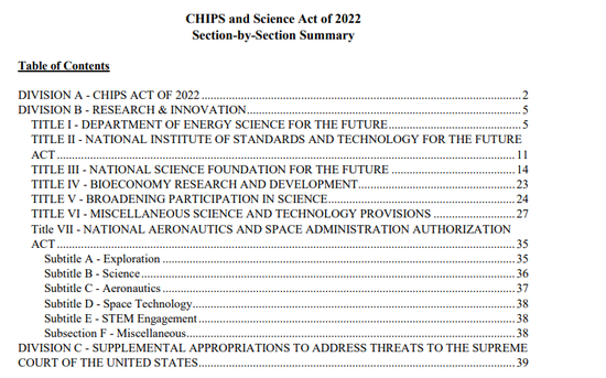 簡(jiǎn)單來(lái)說(shuō),這份《芯片與科學(xué)法案》是由三項(xiàng)法案合并而成的一個(gè)大法案:A 部分是“2022年CHIPS 法案”;B部分是《研發(fā)、競(jìng)爭(zhēng)和創(chuàng)新法》;C 部分是“2022 年最高法院安全資金法案”。其中A和B部分最為關(guān)鍵。