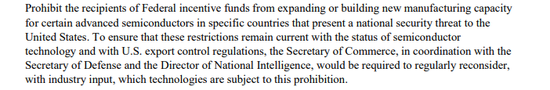 在法案文本中關(guān)于補(bǔ)貼資助對(duì)象資格的內(nèi)容中,明確寫到,禁止接受聯(lián)邦獎(jiǎng)勵(lì)資金的企業(yè),在那些對(duì)美國(guó)國(guó)家安全構(gòu)成威脅的特定國(guó)家擴(kuò)建或新建某些先進(jìn)半導(dǎo)體*的新產(chǎn)能。