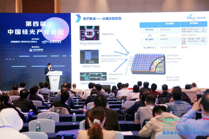 ICC訊 2021年10月28日,武漢光博會期間,蘇州海光芯創(chuàng)光電科技股份有限公司首席科學家陳曉剛博士受邀在第四屆中國硅光產(chǎn)業(yè)論壇(SiPC 2021)上發(fā)表《硅光技術(shù)最新進展機器在超高速光交換網(wǎng)絡的應用》行業(yè)報告。陳博士表示光子集成經(jīng)歷了從分立器件、集成器件再到集成模塊、集成系統(tǒng)。硅本身不是很理想的發(fā)光材料。電子集成的核心器件尺寸再幾個到十幾個納米,而光子集成則是毫米級。