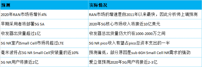 回顧2020年曾經(jīng)的預(yù)測(cè),結(jié)果驗(yàn)證是對(duì)錯(cuò)參半。初步結(jié)果表明,分析師正確預(yù)測(cè)了5G和RAN市場(chǎng)的高增長(zhǎng)趨勢(shì),但同時(shí)又低估了一些5G細(xì)分市場(chǎng)的發(fā)展速度。