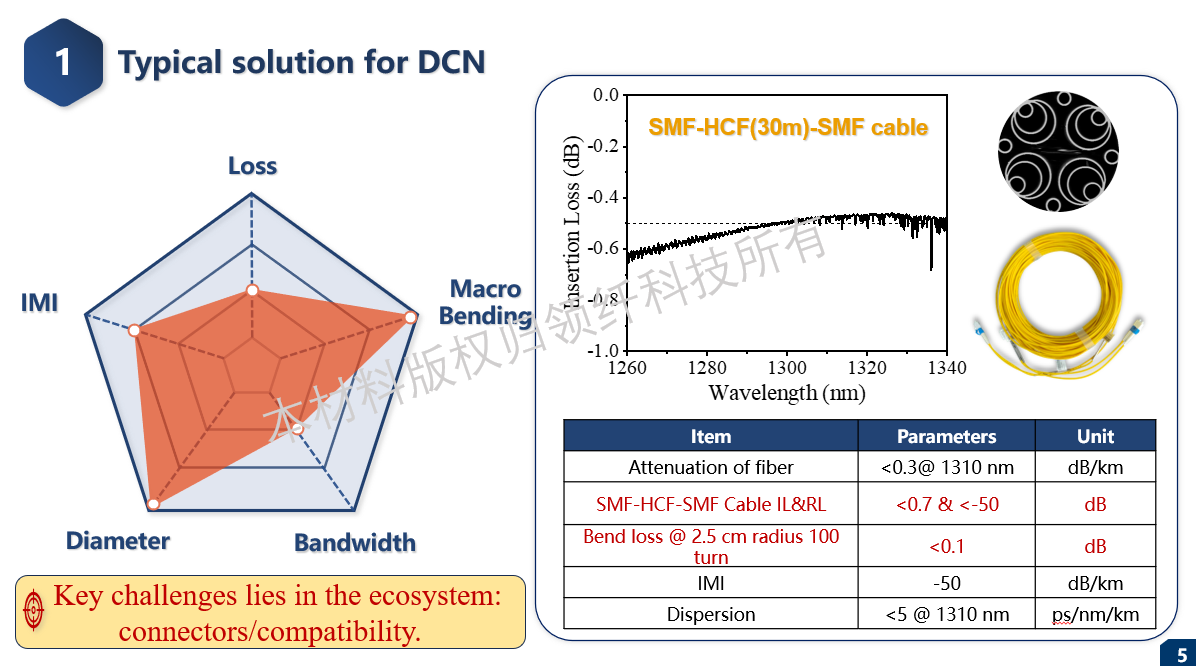 在數(shù)據(jù)中心內(nèi)部(DCN)這一類短距離場景中,可以適當(dāng)放寬對(duì)損耗的極致追求,轉(zhuǎn)而優(yōu)化機(jī)械與結(jié)構(gòu)性能,以提升整體部署效率。但報(bào)告同時(shí)指出,這一場景的真正挑戰(zhàn),并不在光纖本體,而在系統(tǒng)層面:現(xiàn)有光模塊與連接體系幾乎全部基于傳統(tǒng)單模光纖(SMF)構(gòu)建,這帶來兩個(gè)直接問題:空芯與實(shí)芯的接頭損耗成為主要瓶頸,兼容性與接口標(biāo)準(zhǔn)尚未建立。 也正因此,當(dāng)前DCN場景的核心矛盾是:生態(tài)是否準(zhǔn)備好接納新的光纖體系。