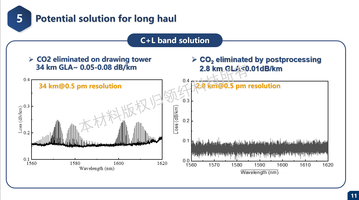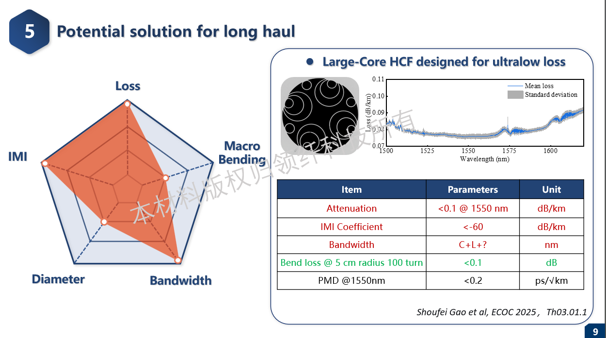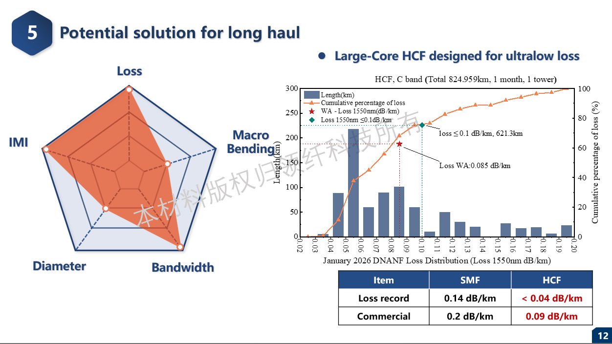 在面向長距離傳輸?shù)膽?yīng)用中,報(bào)告進(jìn)一步展示了大芯徑空芯光纖的性能表現(xiàn)。在連續(xù)拉制實(shí)驗(yàn)中:最低損耗達(dá)到 0.038 dB/km;一個(gè)月拉制過程中,加權(quán)平均損耗約為 0.085 dB/km; 0.05-0.06 dB/km 的損耗區(qū)間,成為產(chǎn)出中的主要集中區(qū)域,并對(duì)應(yīng)超過 200 km 的連續(xù)長度,這說明,超低損耗已經(jīng)從“個(gè)別最優(yōu)結(jié)果”,轉(zhuǎn)變?yōu)榭煞€(wěn)定獲得的工程水平。與傳統(tǒng)單模光纖(SMF)相比:理論極限約 0.14 dB/km,商用水平約 0.2 dB/km,空芯光纖可預(yù)期的理論極限為<0.04 dB/km,未來商用水平可能可以達(dá)到0.09 dB/km。這對(duì)光通信是令人振奮的消息,因?yàn)楫?dāng)損耗降低到這一水平后,系統(tǒng)設(shè)計(jì)的邊界開始發(fā)生變化:放大器間距可以進(jìn)一步拉大、系統(tǒng)能耗與復(fù)雜度下降、長距離鏈路的經(jīng)濟(jì)性被重新評(píng)估。