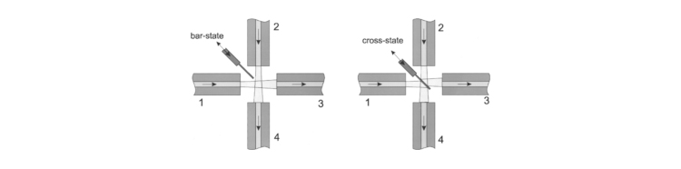 圖3. 2×2端口MEMS光開關(guān)的工作原理,左圖:直通狀態(tài),右圖:交叉狀態(tài)